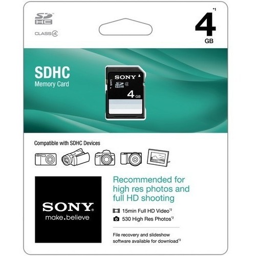 Tarjeta de memoria SDHC Clase 4 de 4GB Sony Media SF4N4 Características del producto Para uso en cámaras digitales, videocámaras y otros dispositivos compatibles con tarjetas SDHC y SDXC, Para Grabación y Fotos FULL HD, Se recomienda la velocidad de clase 4 para grabación AVC-HD Área de etiqueta en la tarjeta para organización y fácil identificación Incluye x- El software para compartir imágenes Pict Story Incluye el software File Rescue La clase 4 admite una rápida transferencia de archivos | |